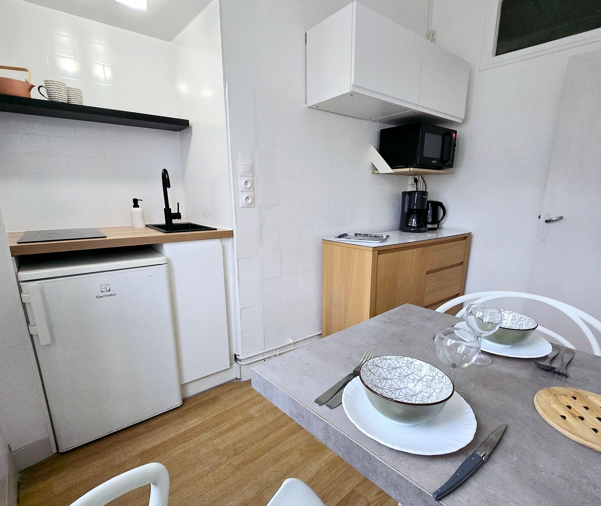 - réfrigérateur, micro-onde, four/grill, plaque électrique, cafetière, grille-pain, bouilloire, produits de base