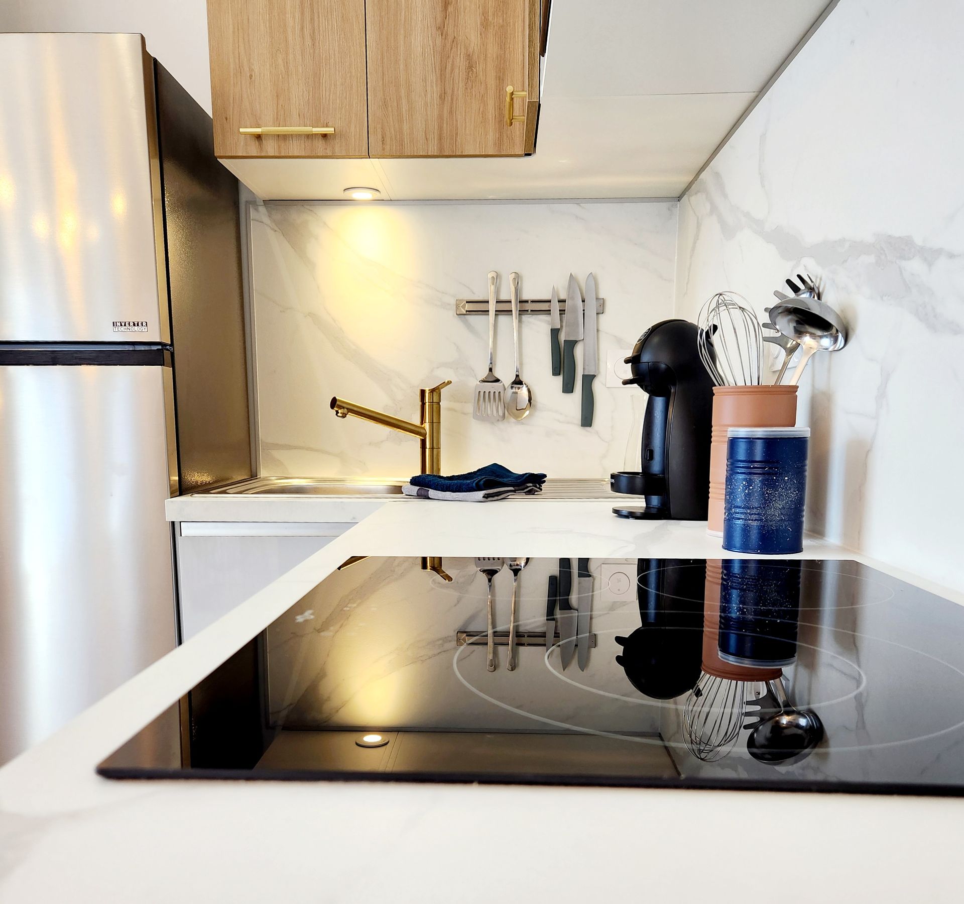 - réfrigérateur/congélateur, micro-onde, four, lave vaisselle, plaque à induction, cafetière, grille-pain, bouilloire, produits de base