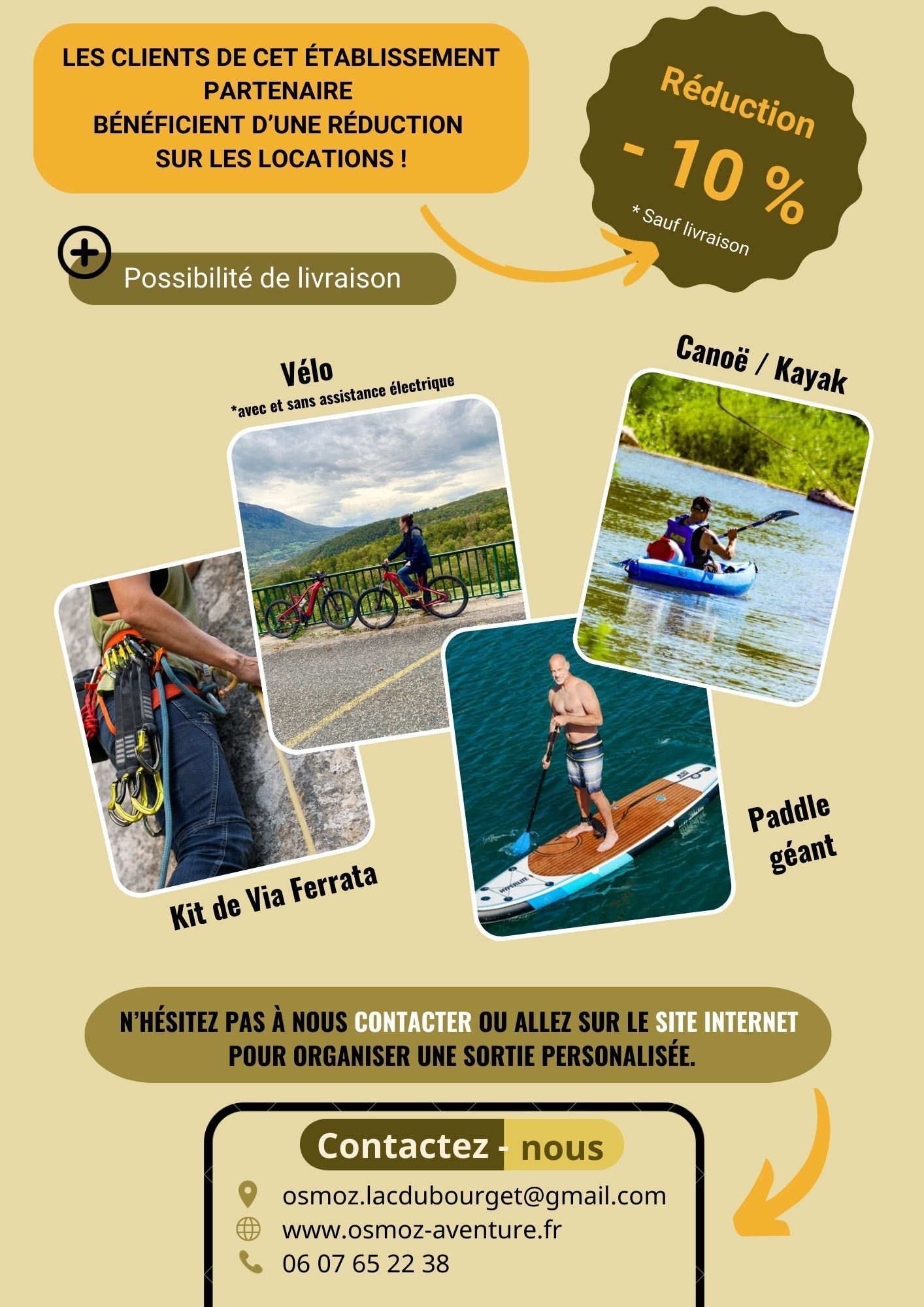 Si vous séjournez dans votre établissement, vous bénéficierez d’une réduction de 10 % sur les locations chez Osmoz Aventure. Une belle opportunité de vivre des expériences inoubliables au cœur de la nature savoyarde !